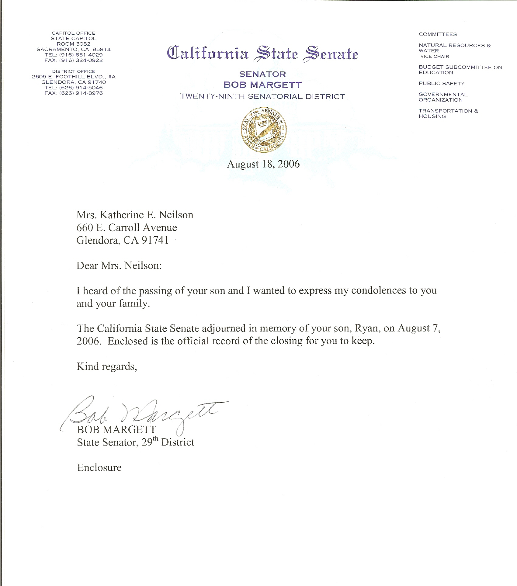 Letter from California State Senate