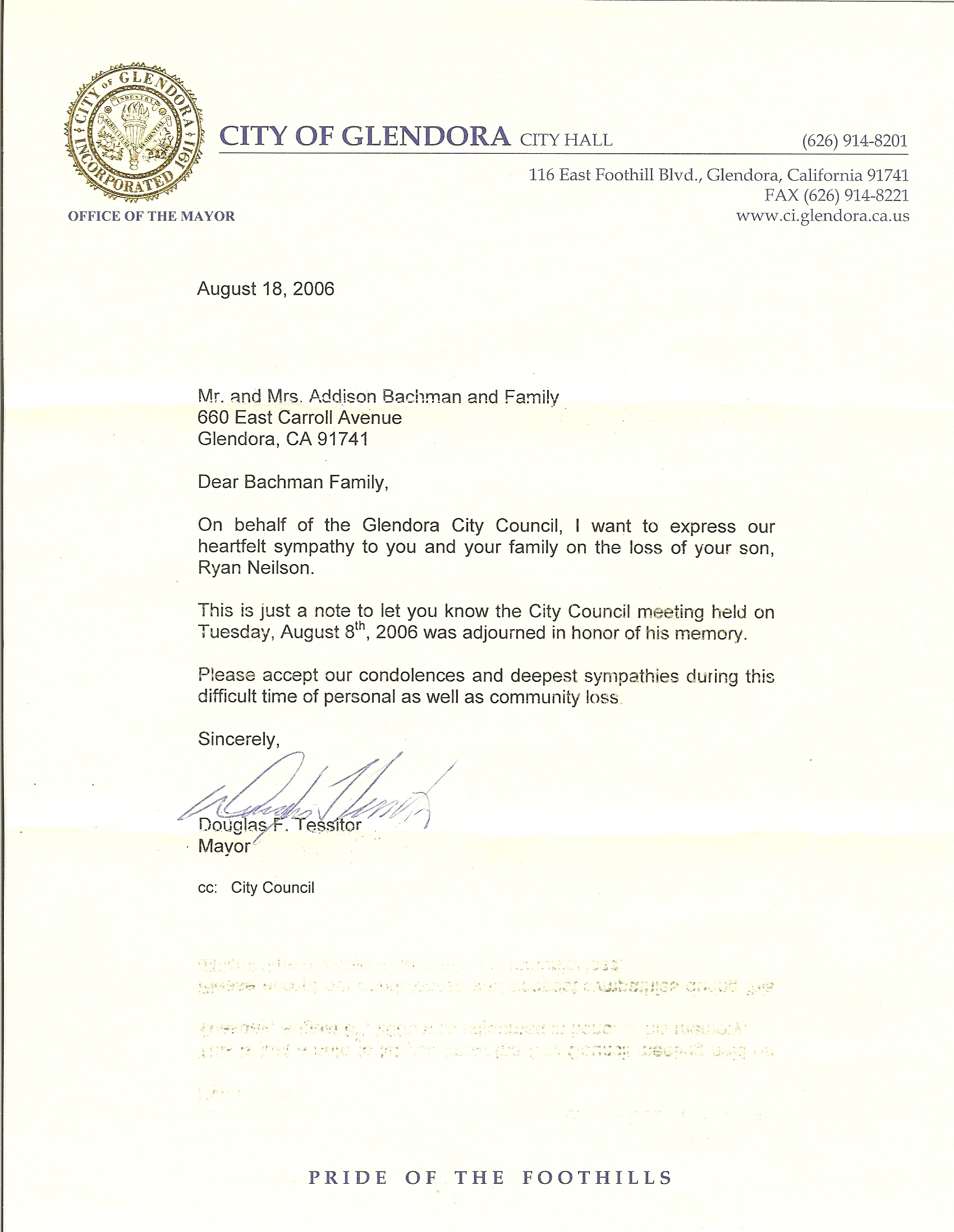 Letter from City of Glendora